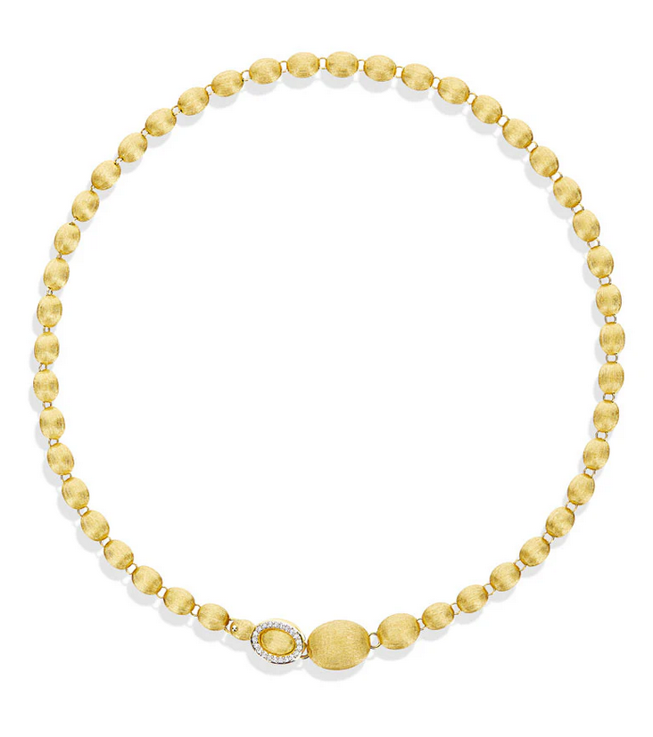 The “string of pearls” according to the designer: it’s made with are our iconic 18kt gold boules hand-engraved, for hours, with the ancient burin technique, until they become light and soft as silk. A jewel that embraces you, made even more unique by the diamond closure that can be fastened to each boule or, why not, combined with its bracelet for a longer effect.